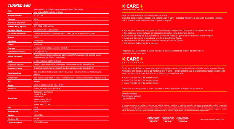 La Tuareg 660 traza un nuevo camino: prestaciones de referencia en todas las condiciones y un auténtico equipamiento de aventura. Dentro del segmento de las motos trail adventure y que encarna a la perfección ese espíritu, la Tuareg 660 está equipada con el nuevo motor bicilíndrico en paralelo de Euro 5 de 660 cc y de 6 marchas, con 4 válvulas por cilindro e inyección electrónica; una potencia de 80 CV a 9.250 rpm, con un par motor de 70 Nm a 6.500 rpm; y un cigüeñal calado a 270º con doble árbol de levas a la cabeza (DOHC). Posee un tanque de combustible de 18 litros y un consumo de 4 L/100km.