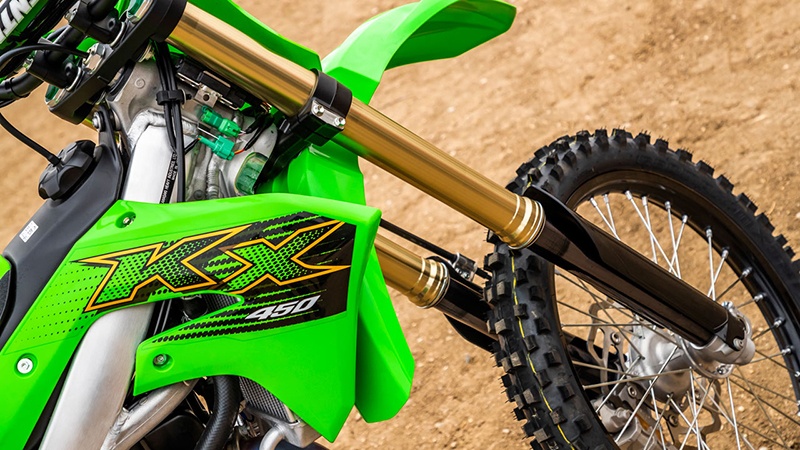 Se destaca en la KX 450 la capacidad de realizar ajustes en la posición de conducción siendo la única del mercado que permite colocar los estribos en varias posiciones. Además el manillar también ofrece cuatro opciones que hacen que esta moto sea válida para la mayoría de los pilotos sin depender su talla.