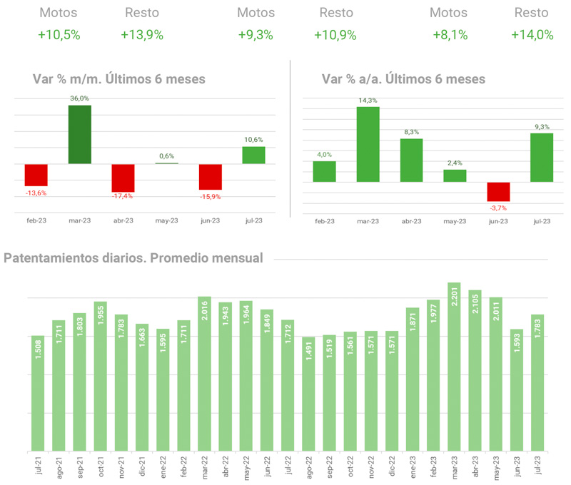 Para dicha entidad, en julio se patentaron 37.987 motovehículos, lo que corresponde a 3.654 unidades más que en el pasado mes de junio (10,64%), y unas 1.589 unidades más que en julio de 2022 en el cual se registraron 36.398 patentamientos (4,37%).