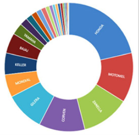 Con respecto a las ventas por marca, Honda volvió a manifestar su preponderancia en el mercado con 9.071 ventas, seguida por Motomel (5.300), Zanella (5.105), Corven (4.895) y Gilera (4.186).