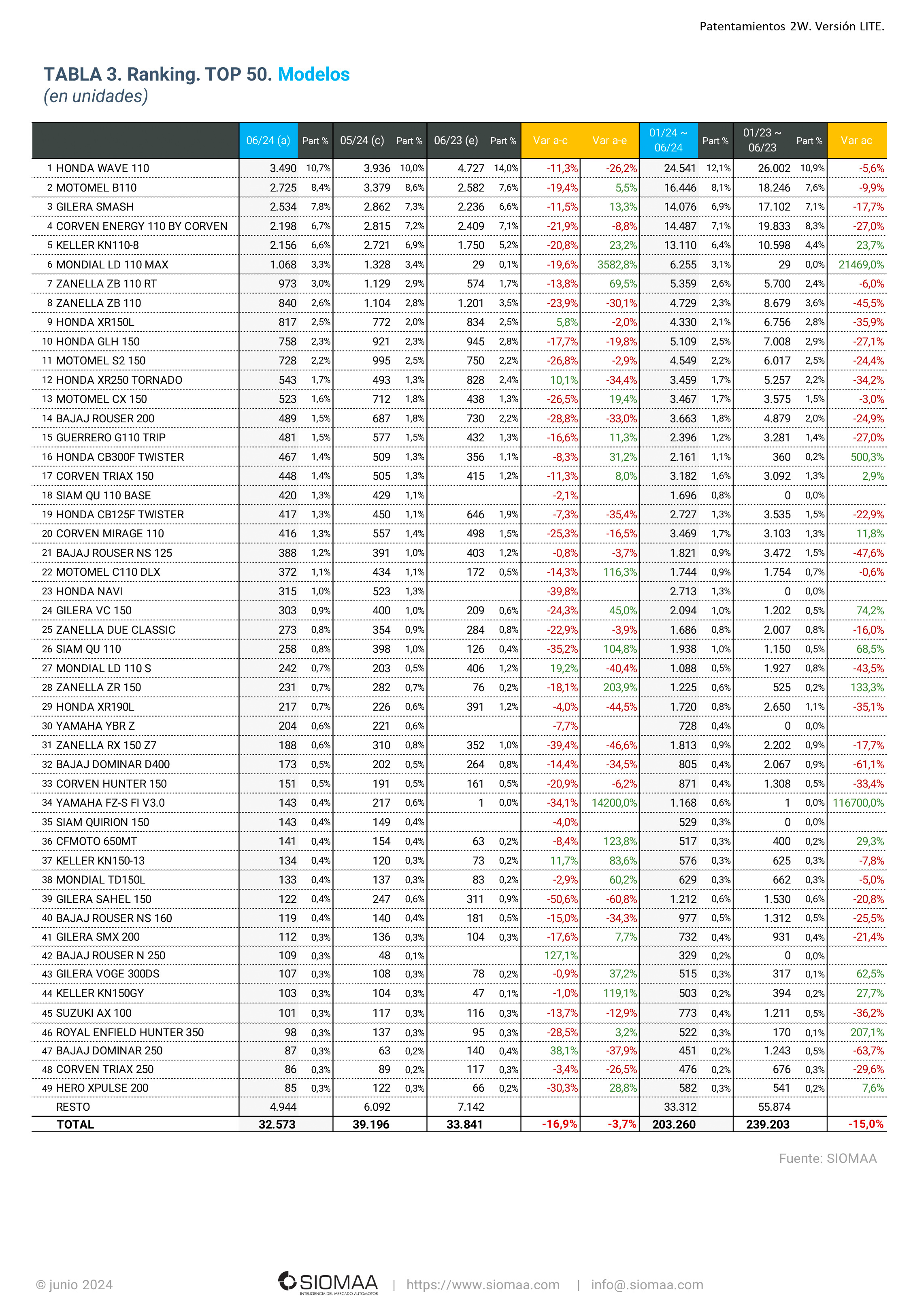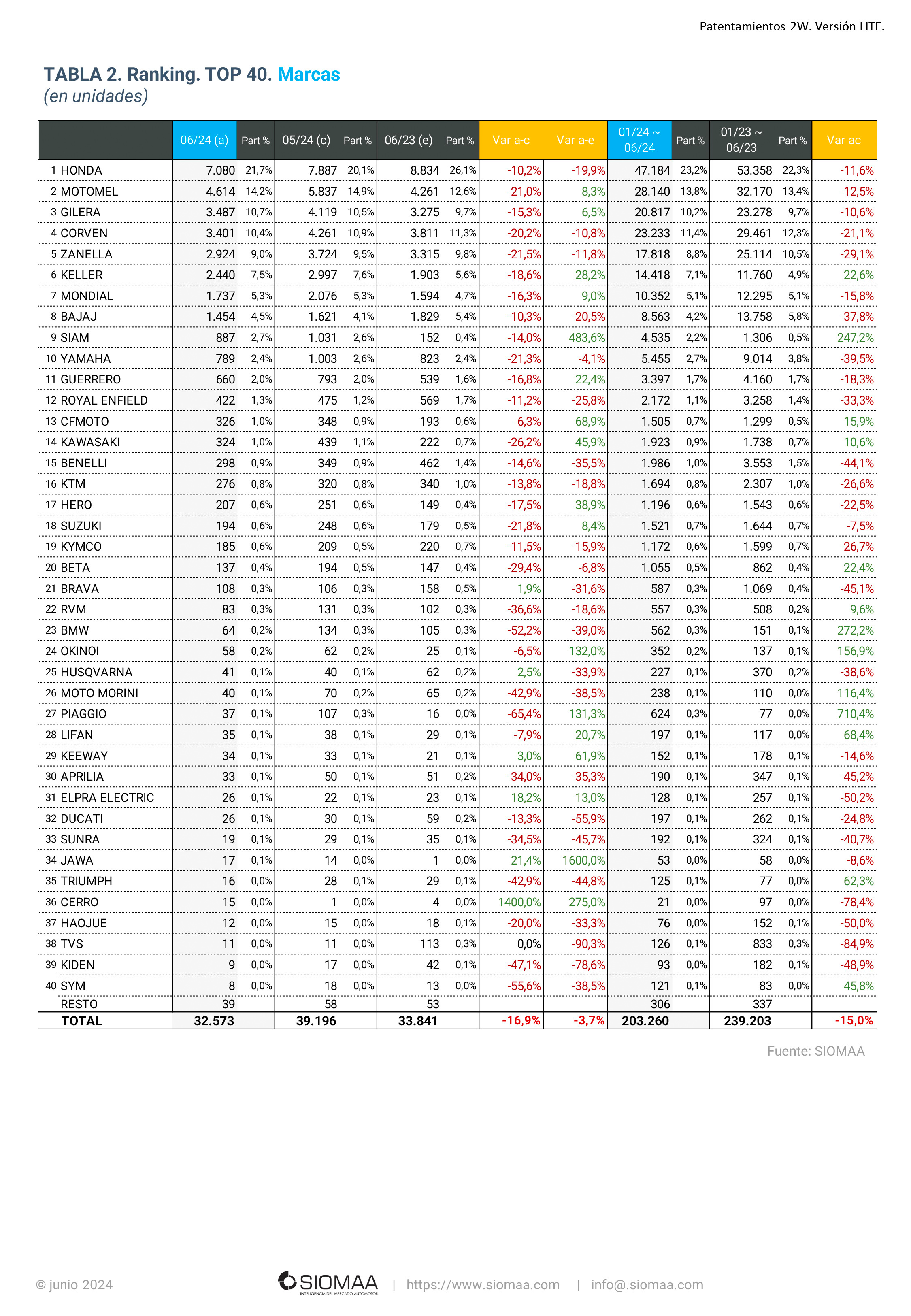 La División Motovehículos de la Asociación de Concesionarios de Automotores de la República Argentina (ACARA) informó que el número de unidades patentadas durante junio de 2024 fue de 32.573 motovehículos, una baja interanual del 3,7% ya que en junio de 2023 se habían registrado 33.841 unidades. Si la comparación es contra el pasado mes se observa una baja del 16,9%, ya que en mayo se habían registrado 39.196 unidades.