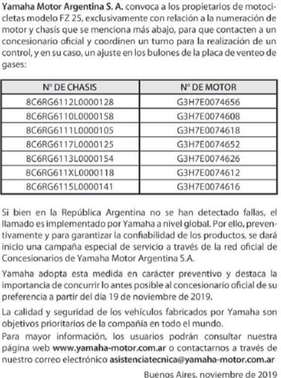 Mediante anuncios publicados en los principales diarios de nuestro paìs, Yamaha llamó a revisión a su moto modelo FZ 25, por un problema en los bulones de la placa de venteo de gases. Las unidades afectadas son exclusivamente las que poseen los siguientes números de chasis y de motor.