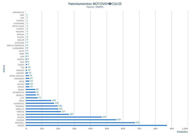 Honda continuó liderando el mercado con 5.229 unidades, seguida por Motomel con 3.973, por Corven con 3.897 y por Gilera en el cuarto lugar con 3.435 unidades.