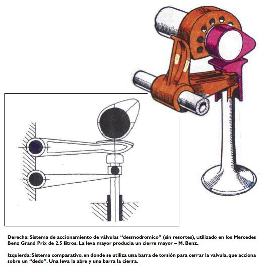 Un diccionario técnico da como definición de desmodrómico lo siguiente "mecanismo relacionado a dos elementos de manera que sus velocidades permanecen iguales". En la práctica, el cierre de las válvulas no lo hace un resorte, sino que lo efectúa un mecanismo similar a dos levas por válvula. Si en realidad, el sistema desmodrómico evita el gasto de energía que se usa para comprimir los resortes, se genera gasto en el rozamiento suplementario. La aplicación más difundida del comando desmodrómico, la realizó Mercedes Benz en 1954 en sus motores de competición de 8 cilindros en línea. Este poseía 2.500 cm³.con inyección directa de nafta de nafta Bosch y desarrollaba 210 KW. de potencia.
