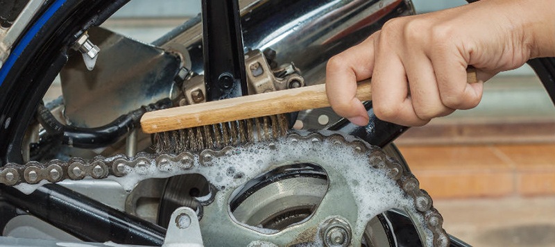 La cadena: Limpiar la cadena y kit de transmisión, contando con un depósito o recipiente para derramar, un cepillo de dientes viejo y un limpiador de cadenas. Poner la moto sobre el caballete y la limpieza puede hacerse con ayuda del líquido y del cepillo a lo largo de la cadena para llegar a cada eslabón.