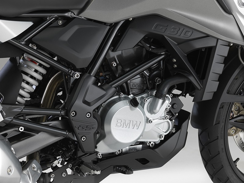 La inclinación del cilindro hacia atrás y la culata girada 180 grados con admisión en la parte delantera y escape en la parte trasera siguen siendo las características del diseño. Esta disposición sigue la lógica de una conducción de aire de combustión óptima y da como resultado una arquitectura de vehículo particularmente compacta. Con una potencia de 25 kW (34 hp) a 9,500 rpm y un par máximo de 28 Nm a 7,500 rpm, el motor monocilíndrico de la nueva BMW G 310 GS es el socio ideal para el placer dinámico del motociclismo, incluido en la actual homologación EU-5.