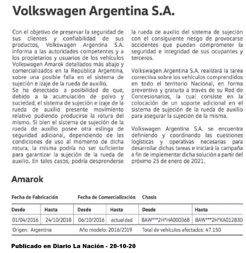 Ante la posibilidad de un desperfecto en el sistema de sujeción de la rueda de auxilio, que podría causar que la misma se suelte durante la marcha y caiga al camino, Volkswagen Argentina realizará un recall de su pick up mediana Amarok.