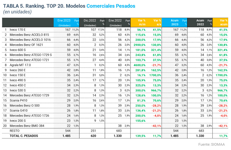 En este marco, el Iveco Tector 170 E, modelo que ya había liderado las ventas en 2022, fue el más vendido en enero con 167 patentamientos. Completaron el podio de enero dos Mercedes-Benz: el Accelo 815, con 69, y el Accelo 1016, con 66.