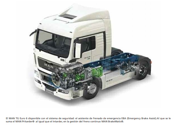Para los vehículos MAN TG Euro 6 hay disponible otro sistema de seguridad: el asistente de frenado de emergencia EBA (Emergency Brake Assist). Las estadísticas demuestran que el final de un obstáculo en una autopista es una de las situaciones que provocan accidentes por alcance con una frecuencia significativa. En la circulación en caravana, la visibilidad hacia delante se encuentra limitada y las frenadas de los vehícu los precedentes se reconocen a menudo demasiado tarde como frenada de peligro. El objetivo del asistente es prevenir o mitigar accidentes por alcance graves en tales situaciones. Si el conductor no reacciona a las advertencias del sistema, el asistente de frenado de emergencia EBA inicia una frenada de emergencia de manera autónoma. En torno al 32 % de los accidentes de camiones son accidentes por alcance.Un sistema de asistencia de frenado de emergencia automático puede reducir notablemente la probabilidad de accidentes por alcance. Incluso si la situación del accidente no permite evitar completamente el choque, el frenado automático disminuye significativamente la gravedad del accidente en muchos casos reduciendo la energía del impacto. Esta energía disminuye con la reducción del valor de la velocidad al cuadrado.