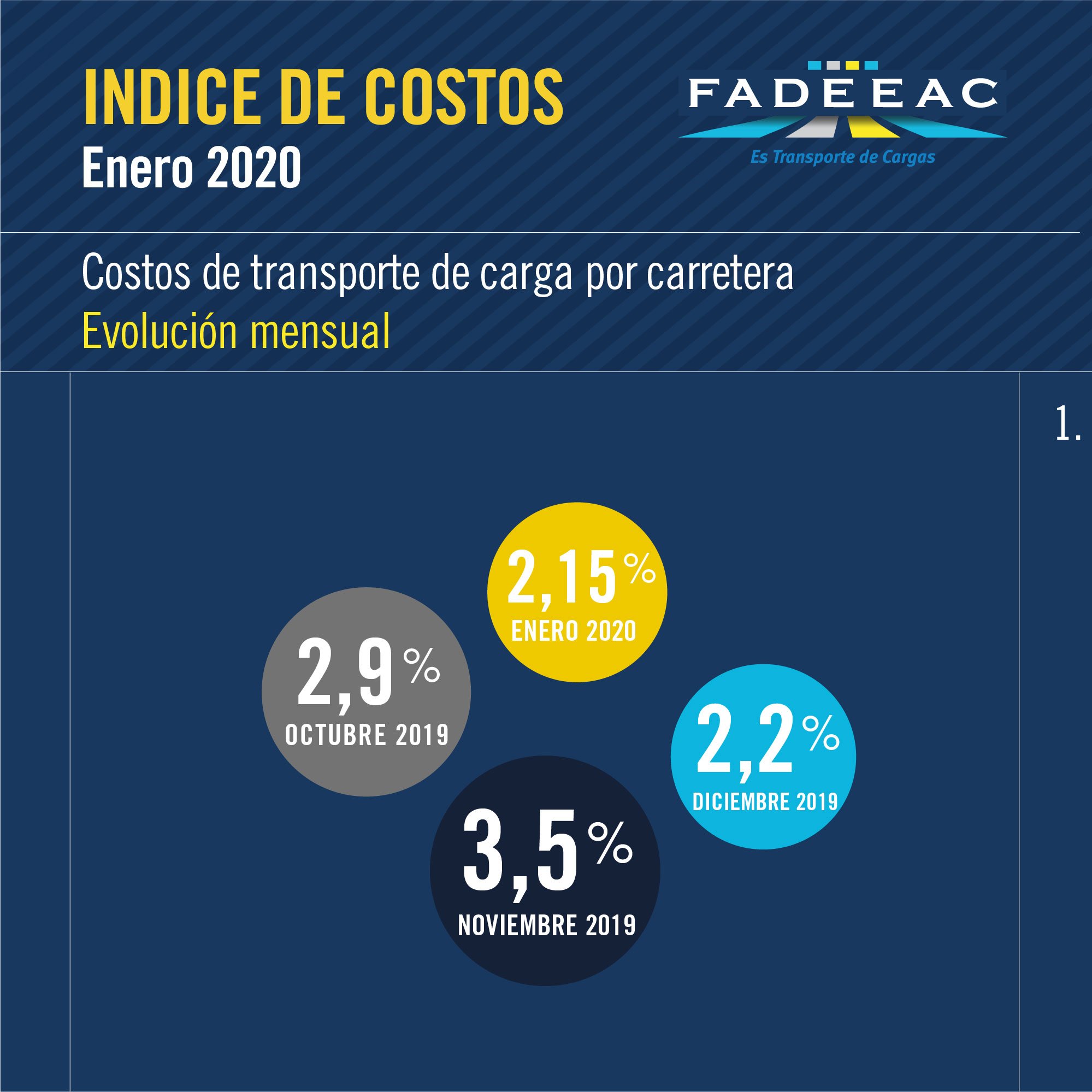 En un escenario nacional de la economía que encierra expectativas de mejora, los costos de transportar mercadería por carretera siguen aumentando. En los últimos doce menos, treparon un 45.5%, si se incluye la suba de enero del 2.15%. Así lo evidenció la Federación Argentina de Entidades Empresarias del Autotransporte de Cargas (FADEEAC) a través de su Índice de Costos mensual.