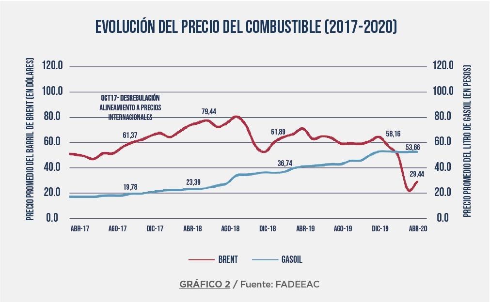 "Desde la irrupción y diseminación del COVID-19 el petróleo cayó de un promedio de u$s 60 por barril que cotizó durante el año 2019 y principios del año 2020, hasta menos de u$s 25 (variedad Brent, referencia en la Argentina) este lunes, valor mínimo en 20 años. En la mayoría de los países del mundo frente a este escenario los precios del combustible bajan, pero en Argentina siguen subiendo", afirmó Martín Borbea Antelo, Secretario General de FADEEAC.