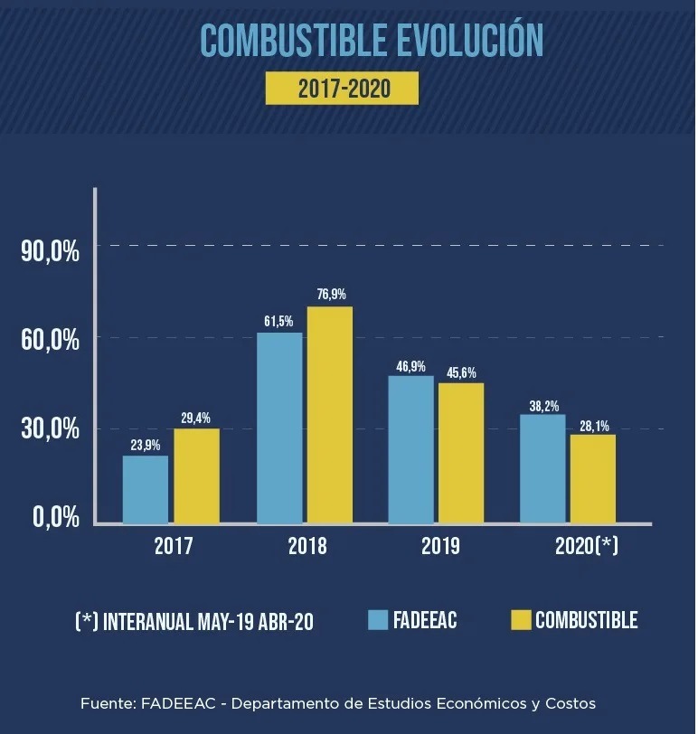 Según el ICTF, en abril se ve un aumento del costo laboral, del segundo tramo del convenio firmado en febrero, con su impacto directo en personal -conducción (6,33%)- y en los rubros: reparaciones (3,10%) y gastos generales (2,80%). Pero, se observa un descenso del combustible (-0,04%), y se destaca la importante baja del costo financiero (-22,4%). Este último factor es consecuencia de las bajas tasas de interés, como medida anticíclica, para recomponer la cadena de pagos.