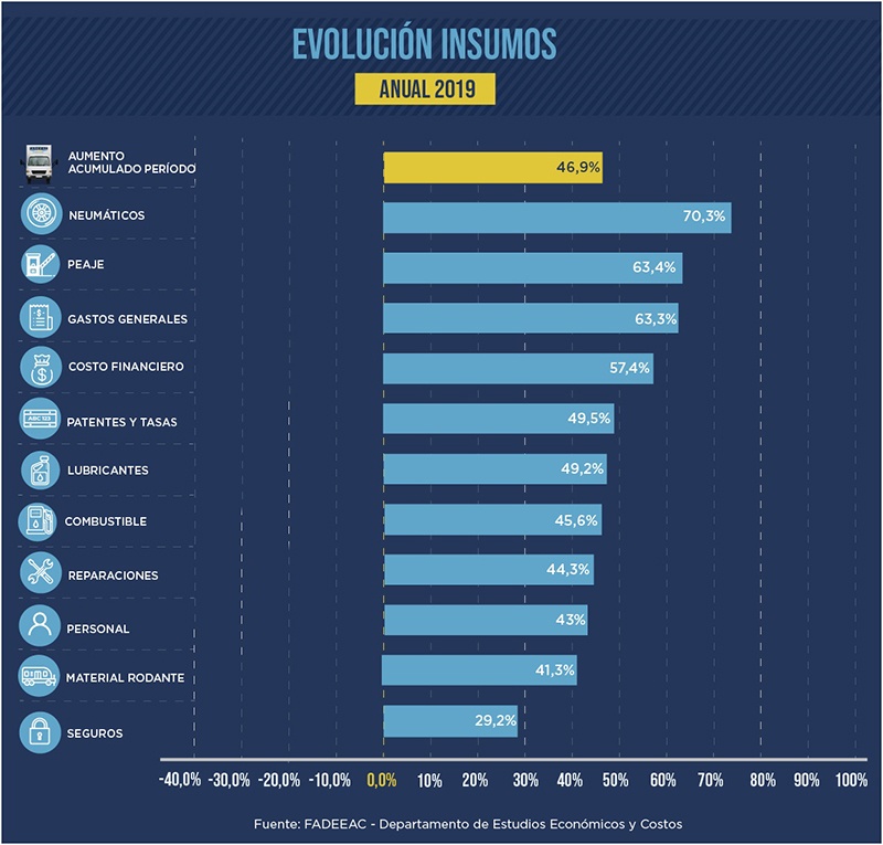 Durante este periodo, lideraron los incrementos de costos las patentes (57,9%), los gastos generales (31,7%), el personal (21,5%) y los neumáticos (21,2%). En tanto el combustible se ha mantenido prácticamente sin cambios (-0,7%) al tiempo que el costo financiero presenta un importante descenso (-27%) en el semestre, en el marco de las fuertes bajas de las tasas de interés como factor contracíclico al notorio deterioro en la cadena de pagos que están sufriendo las empresas, dada la caída de la actividad.