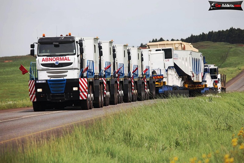 Por contar con grandes espacios abiertos para transportar mercaderías, no se usan trenes en Sudáfrica, sino que usan camiones. Y el El Pacific Ultra es el más utilizado, con un largo de 130 metros gracias a 5 cabezas tractoras, 3 adelante y 2 atrás, conectadas a un remolque apto para llevar hasta 1000 toneladas. Colosal !!!