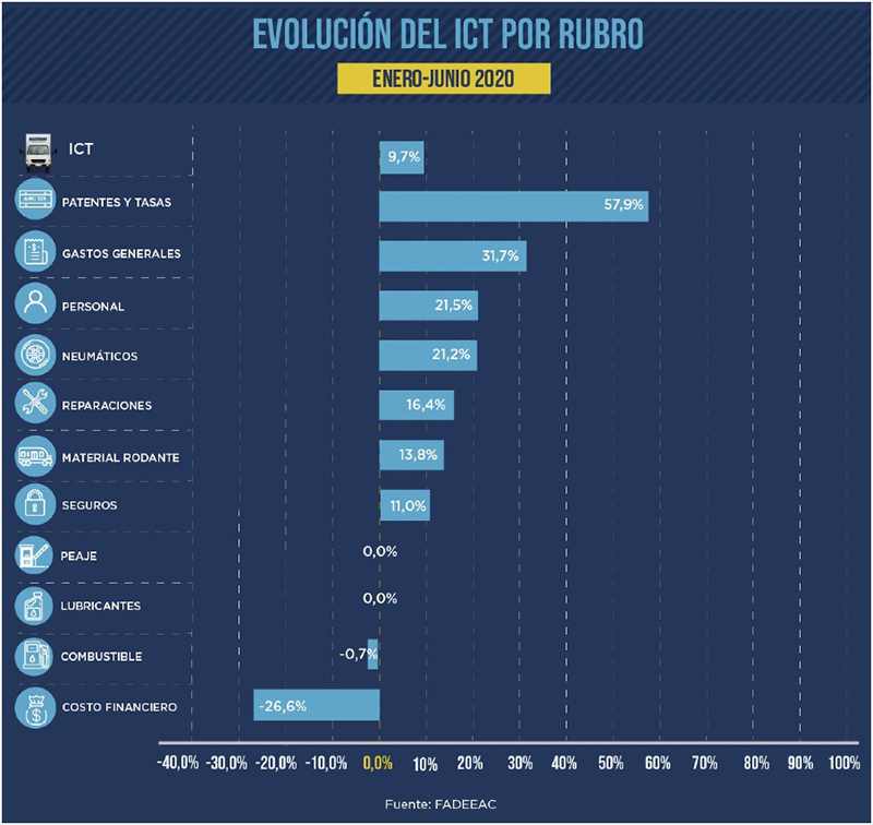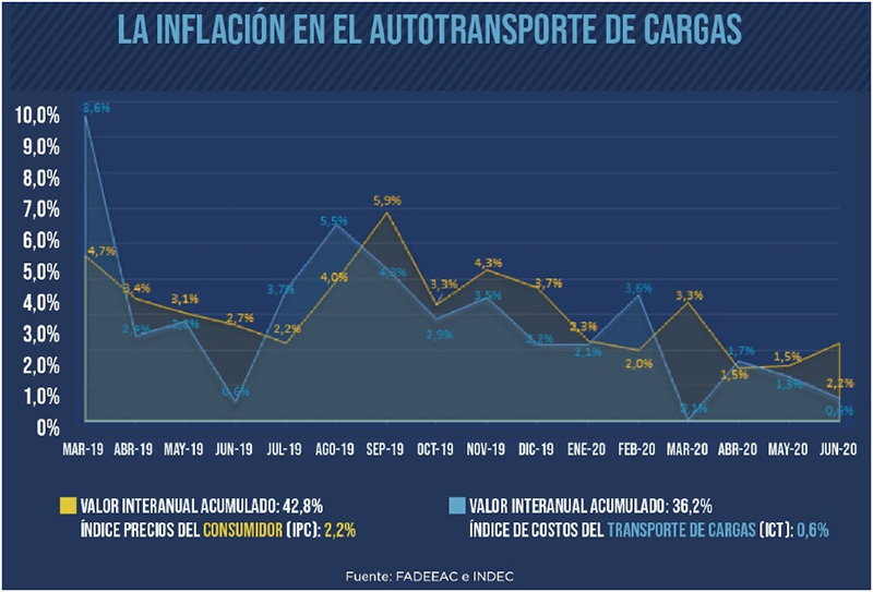 Según un análisis del Departamento de Estudios Económicos y Costos de la Federación Argentina de Entidades Empresarias del Autotransporte de Cargas (FADEEAC), se pronostica una desaceleración de los costos del transporte de cargas y la inflación para este año, teniendo en cuenta la evolución de ambos indicadores en 2018 y en 2019. En el primer semestre del año, el Índice de Costos FADEEAC (ICTF) fue de 9,7%, mientras que el Índice de Precios al Consumidor (IPC) fue de 13,6%. En cambio en 2018, el ICTF fue del 61,5%, valor récord desde 2002, y la inflación del 47,6%. Por su parte, mientras que en 2019 el ICTF fue de 46,9 %, la inflación fue de 53,8%, cifra récord desde 1991.