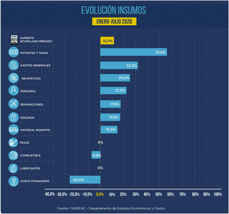 Entre enero y julio, lideraron los aumentos: patentes (57.9%), gastos generales (32.3%), neumáticos (25.5%) y personal (21.5%). Combustibles se ha mantenido prácticamente sin cambios (disminuyó 0,8%) al tiempo que el costo financiero presenta un importante descenso (-26%) en el período, en el marco de las fuertes bajas de las tasas de interés como factor contracíclico al notorio deterioro en la cadena de pagos que están sufriendo las empresas, dada la caída de la actividad.