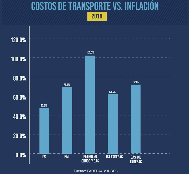 Según el Departamento de Estudios Económicos y Costos de la Federación Argentina de Entidades Empresarias del Autotransporte de Cargas (FADEEAC), el Índice de Costos del Transporte elaborado por la federación (ICTF) para el mes de agosto será el más alto del año, con un piso de 4% (el valor más alto registrado previamente fue en febrero, con un 3,6%). De este modo, los costos del transporte acumularían un 15% desde enero, teniendo en cuenta el reciente convenio colectivo firmado, que establece una suba del 8% para el corriente mes y a que se autorizaron esta semana incrementos en los combustibles del 4,5%. Si bien en los meses previos el ICTF registró aumentos por debajo del Índice de Precios al Consumidor (IPC), ampliando así la brecha entre ambos indicadores, con estos nuevos incrementos la distancia entre ambos se reduciría significativamente.