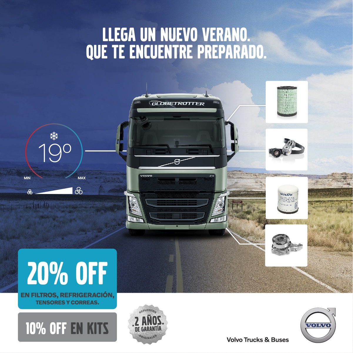 Hasta el 31 de diciembre del 2020, los clientes de Volvo pueden acceder a un descuento del 20% en la compra de los siguientes repuestos: filtros, piezas de refrigeración, tensores y correas. Por su parte, los kits, que ya poseen un precio especial por conjunto de piezas, la misma promoción contempla un 10% de descuento en Kits de esas mismas familias, que se acumula a la promoción vigente de financiación en 6 cheques.