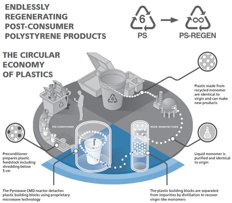 La tecnología desarrollada por Pyrowave, empresa canadiense pionera en la electrificación de procesos químicos y en el reciclaje de plásticos, permite obtener estireno reciclado partiendo del plástico procedente de envases, paneles de aislamiento o electrodomésticos, por ejemplo. El estireno es un importante monómero* que se utiliza en la producción de poliestireno, así como en la producción del caucho sintético utilizado en la fabricación de neumáticos y en un gran número de productos de consumo.