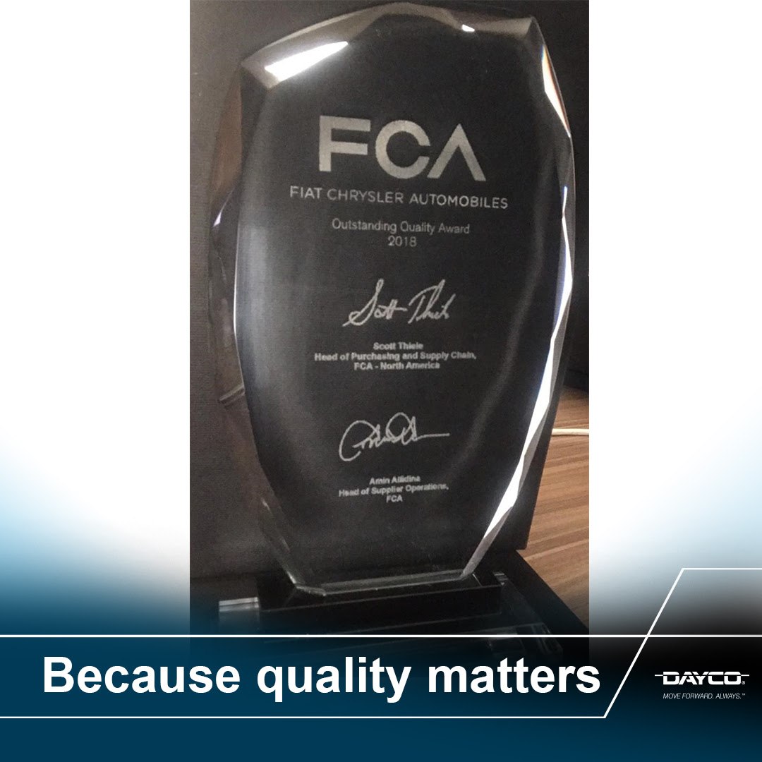 Dayco, proveedor líder de productos de motor y sistemas de transmisión para las industrias automotriz, industrial y de posventa, ha sido reconocido por su excelente calidad, por el fabricante mundial de vehículos Fiat Chrysler Automobiles (FCA) tanto para su parte de producción como para el suministro de partes de Mopar®.