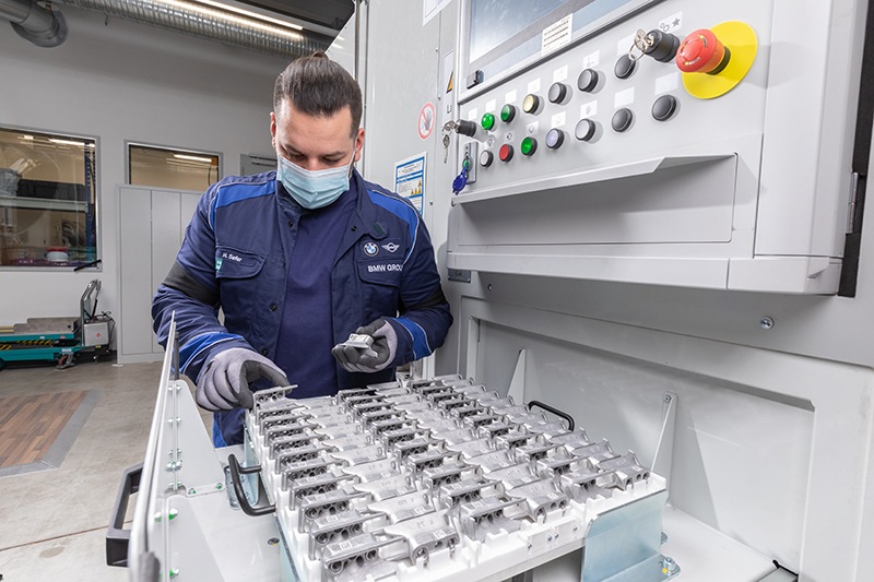 En la planta de BMW Group Landshut, las piezas metálicas se fabrican actualmente mediante fusión por rayo láser. En producción, los componentes metálicos impresos en 3D se instalan en carrocerías de automóviles en un proceso casi completamente automatizado. Los componentes poliméricos del Campus de Fabricación Aditiva y el sustrato metálico para el panel embellecedor se instalan en los automóviles.