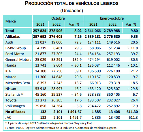 Dicha estadística, que surge de la consideración de vehículos livianos, es parte de un sector que, en el período enero – octubre, alcanzo un total de 2.789.988 unidades producidas, lo cual implicó un crecimiento interanual del 9,8% para la industria mexicana.