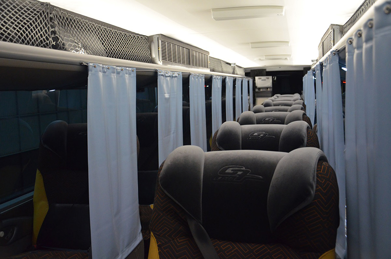 La misma está compuesta por su nueva ubicación de asientos, con tres butacas por fila y dos pasillos, con cortinas individuales con protección antimicrobiana, y un sistema de desinfección de los baños.