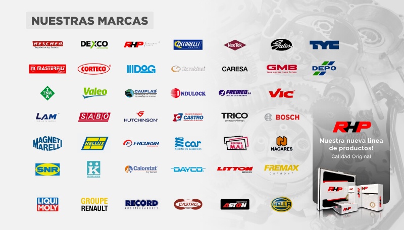 Permanentemente realizamos la selección de nuestros proveedores para poder ofrecerles a nuestros clientes productos de calidad y a los mejores precios del mercado. Las marcas que distribuimos son de primera línea, además de tener acuerdos con fabricantes del exterior en determinados artículos. Algunas de las marcas con las que trabajamos son Gates, Record, Magneti Marelli, Bosch, Hellux. Y lo más importante es que también tenemos nuestra propia marca RHP by Julmar, la cual cuenta con una amplia variedad de productos.