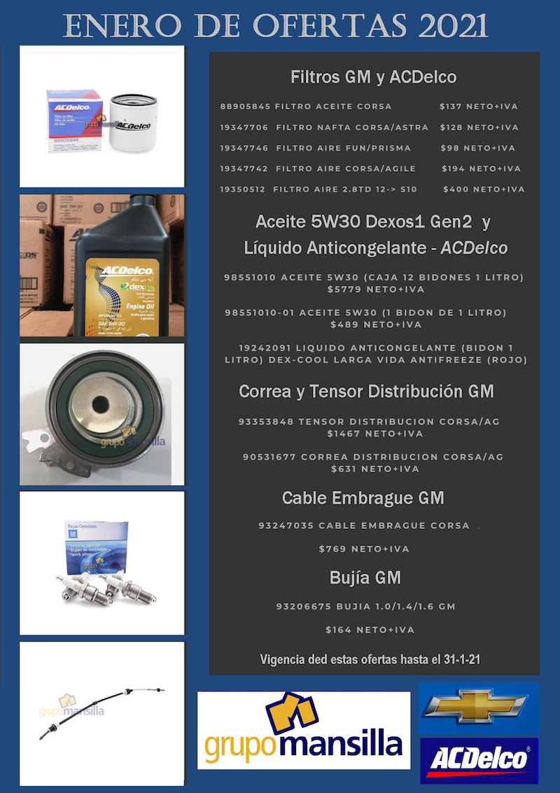 Grupo Mansilla, primer Distribuidor Oficial de Repuestos y Accesorios Originales Chevrolet en Argentina, y nombrado Distribuidor Oficial ACDelco en el año 2018, cuenta con una completa y amplia línea de repuestos y accesorios originales para cada uno de los modelos Chevrolet, que junto a su moderno sistema de distribución permite un rápido despacho a toda la República Argentina y exterior.