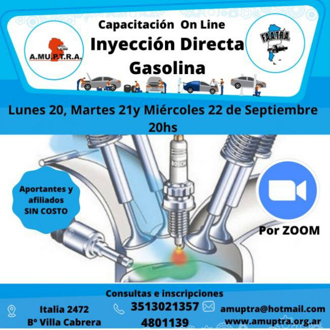 Organizado por FAATRA y AMUPTRA Córdoba, llega una capacitación destinada a profesionales mecánicos, medio oficial con conocimientos de electricidad y electrónica automotor y manejo de osciloscopio, scanner y multímetro, que hayan cursado Inyección Electrónica Nafta. A partir de este curso, que se realizará en tres clases virtuales de tres horas cada una los días 20, 21 y 22 de septiembre a las 20 hs., los participantes podrán diagnosticar automóviles equipados con sistema de inyección directa de gasolina.