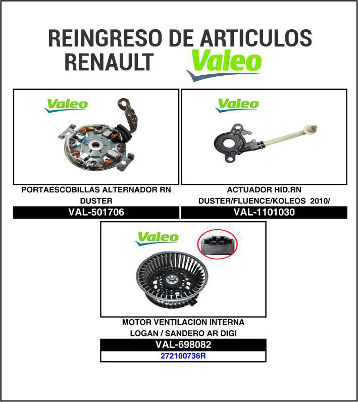 Reingreso de artículos para GM, Fiat, Peugeot, Renault, Toyota y Ford.