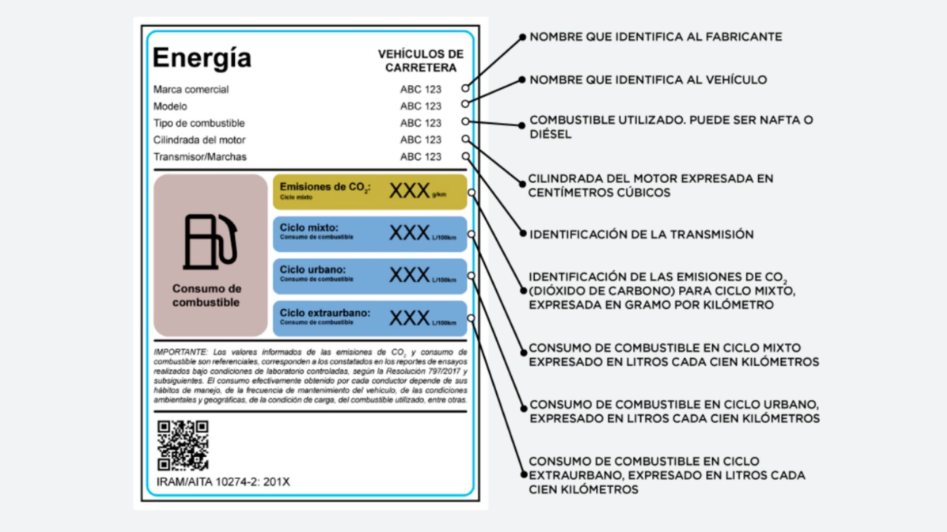 Para comenzar, como primer paso, en Junio de 2020, la totalidad de los vehículos livianos en oferta, deberán tener pegada una primera etiqueta que informará el caudal de nafta que gasta en ciudad, ruta y en zonas mixtas, en litros cada 100 km; y además, cuánto dióxido de carbono emite, en gramos por km.