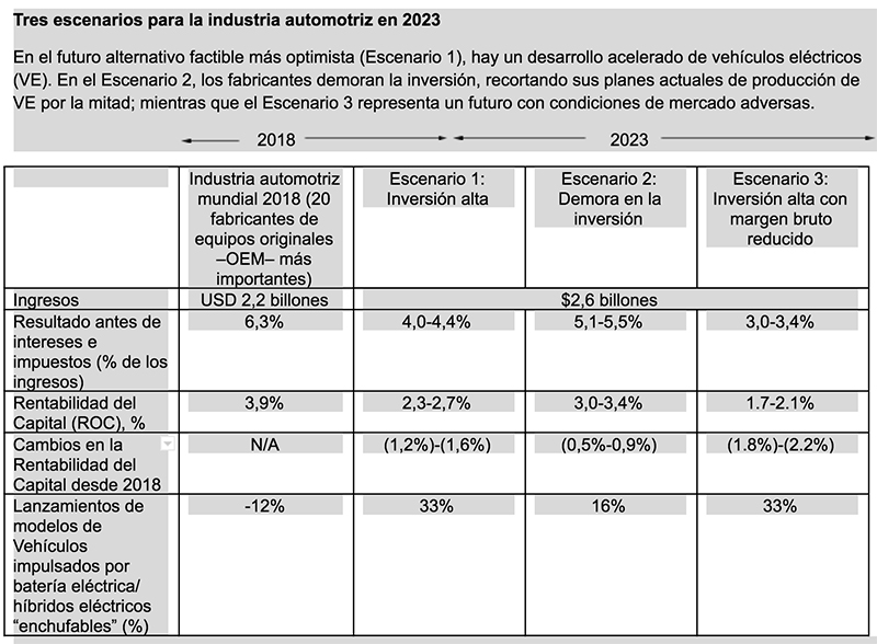 Al analizar la manera en que la industria automotriz podría evolucionar durante la próxima década surgen tres escenarios diferentes, que varían según el nivel de inversión y la respuesta del mercado. En las tres perspectivas encontramos que las mediciones financieras empeoraron y los márgenes operativos cayeron entre 2.8 y 5.1 por ciento desde el nivel actual de 6.2 por ciento.