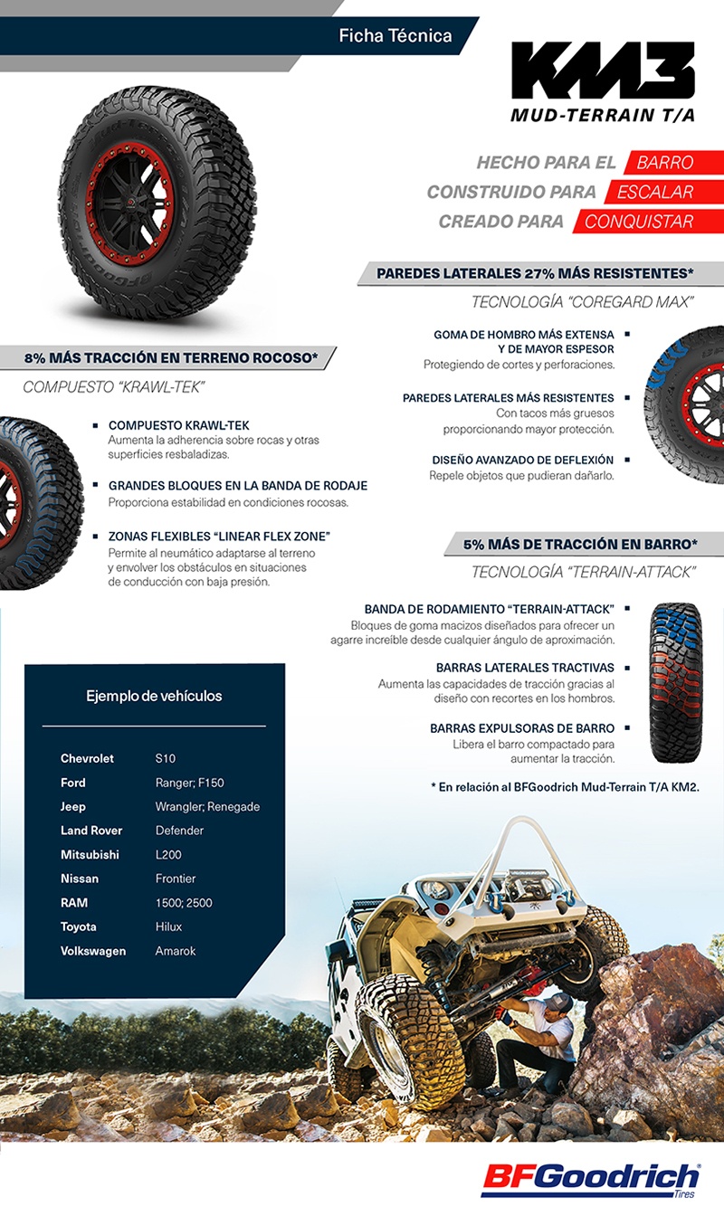 Otro de los neumáticos todoterreno para condiciones extremas que estará montado en algunos vehículos (buggies, camionetas y UTV) es el BFGoodrich Mud-Terrain T/A KM3. Sus tacos macizos aseguran un agarre desde cualquier ángulo; mientras que los flancos de mayor espesor, con triple carcasa y un compuesto especial lo protegen de las agresiones típicas del suelo, como piedras, haciéndolo más resistente.