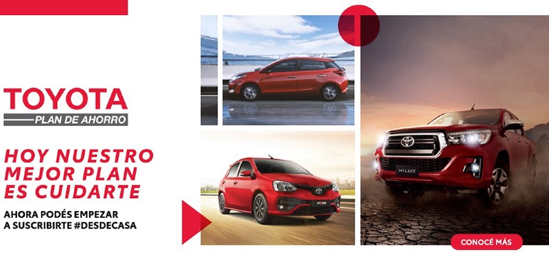 Bajo el "Hoy nuestro mejor plan es cuidarte" Toyota Plan de Ahorro, llegó a un acuerdo con Mercado Libre para desarrollar un sitio exclusivo dentro de esta plataforma de comercio electrónico, en el que los clientes podrán suscribirse a Toyota Plan de forma online, sin salir de su domicilio sencillamente.
