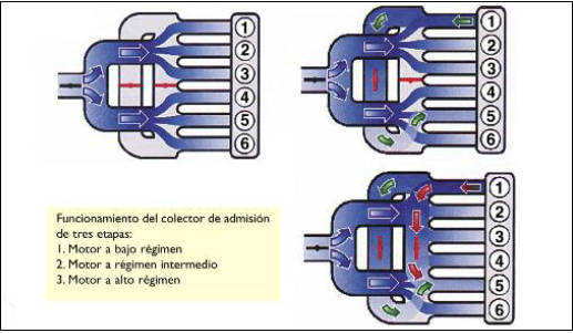 En el flujo de aire en movimiento, se produce un pico de presión, que debido a los deflectores comandados por sensores, ingresa a los cilindros sucesivos del orden de encendido (1-5-3-6-2-4) optimizando el llenado.