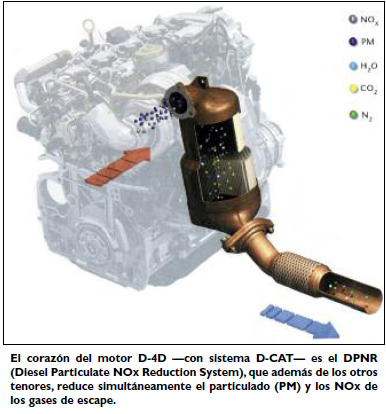Siempre hablando de emisiones, la reducción de los “óxidos de nitrógeno” (NOx) ha representado un gran desafío. En la actualidad el valor es de 0,25 gramos por kilómetro (Euro 4). La disminución de esta emisión se da gracias a la reducción de la relación de compresión —de 15,8 a 1— y a la adopción de los filtros DeNox, que desde hace años se utilizan sobre los motores gasoleros. Una interesante solución puesta a punto por la firma Toyota, sobre el motor 2.2 litros D-CAT de 177 CV de potencia, es el denominado catalizador DPNR (Diesel Particulate NOx Reduction System), es decir Sistema de Reducción de Partículas NOx Diesel, de 4 vías para la reducción del particulado y de los óxidos de nitrógeno.