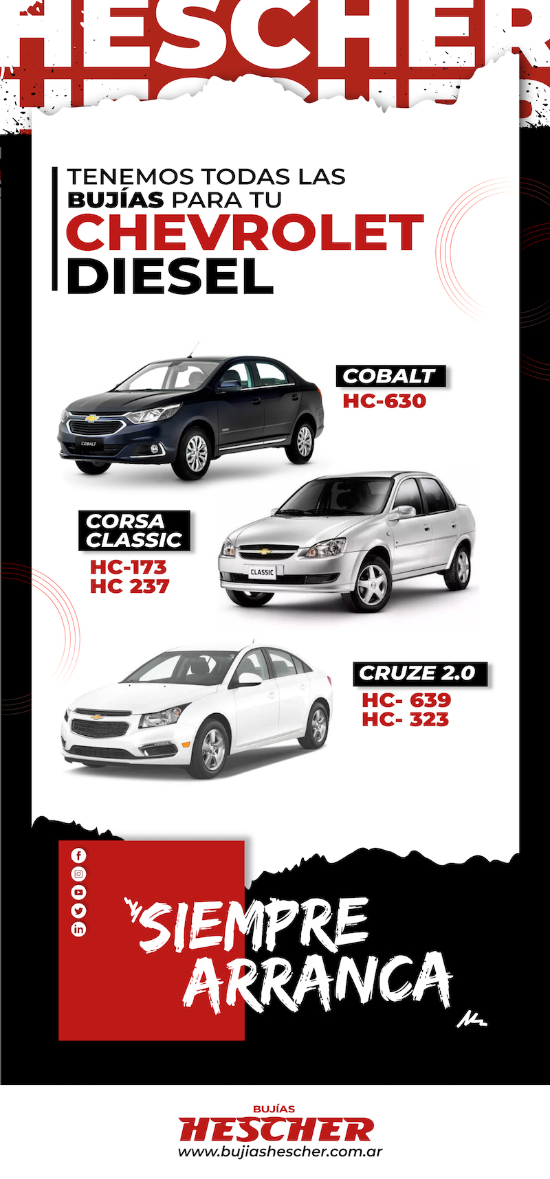 Para modelos Cobalt HC 630, Corsa ClasicHC 173/237, Cruze 2.0 HC 639/323.