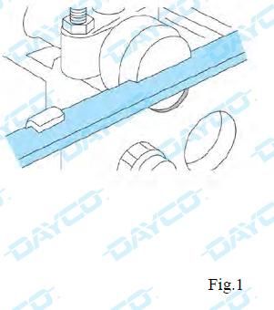 Compruebe que el cigüeñal esté en el PMS del cilindro N° 1 y que la barra de bloqueo del árbol de levas (303-367) esté colocada correctamente (Fig. 1).