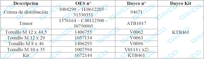 - Una correa de distribución 94671 con 117 dientes y 22 mm de ancho (OES 1004299 — 1E0612205 - 31330351)