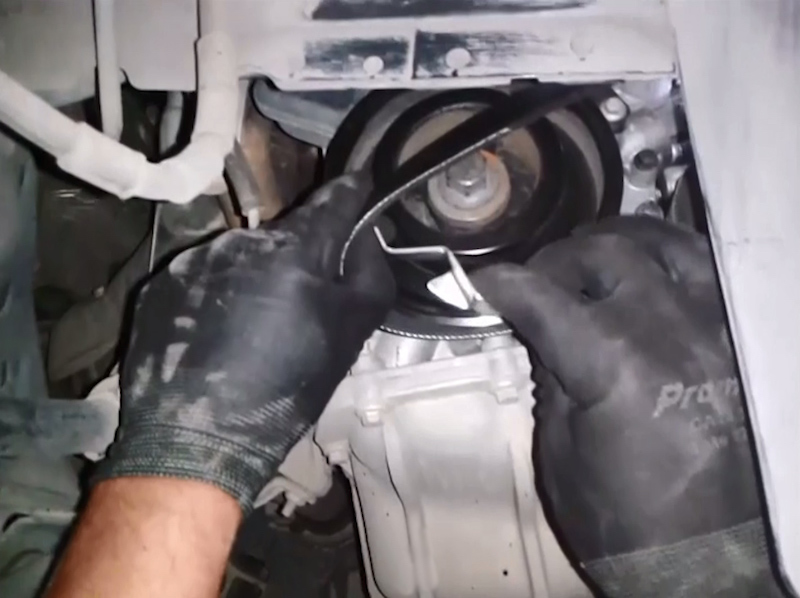 - Encastre el saliente lateral de la herramienta en la polea, de modo que esta empuje a la correa.