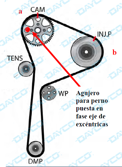 • Monten la correa de distribución, verificando que las muescas en la misma se encuentren alineadas con las muescas de los piñones (a , b ) y que la corma esté bien tensada. Entre las referencias del piñón eje de excéntricas y del piñón bomba alta presión deberán resultar 19 dientes