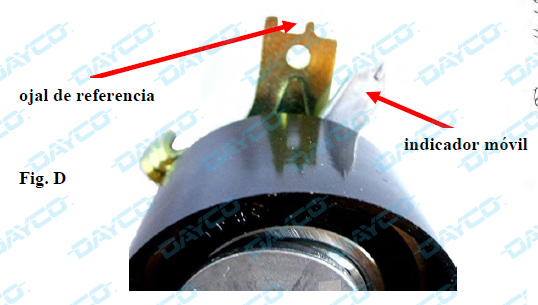 • Utilizando tina llave Allen de 6 mm, hagan girar en sentido anti-horario la polea del tensor hasta llevar el indicador móvil a la extremidad derecha del ojal de referencia de la placa (Fig. D)
