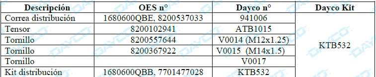 Informacion Técnica Dayco: Kit de distribución KTB532 para modelos Nissan, Renault, Dacia