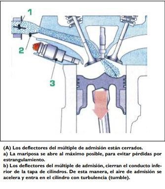 En regímenes de rpm. y estados de carga bajos e intermedios, el motor trabaja con "mezcla pobre", la nafta se inyecta al final de la compresión, obteniendo así una distribución estratificada de la nafta en la cámara de combustión.