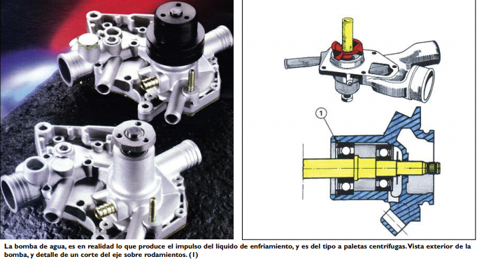 La denominada bomba de agua o de líquido, es en realidad la que produce el transporte del líquido de enfriamiento, y su ubicación es por lo general en la parte delantera del block cilindro. Es una bomba del tipo centrifuga a paletas, y es instalada entre el block, y el radiador del circuito. Normalmente está compuesta por un cárter o carcasa, en cuyo interior se aloja un eje en cuyo extremo, va montado a presión el rotor o turbina. El accionamiento de la bomba, se realiza a través de una polea, que es movida por una polea del ciguenal de motor, a través de una correa trapezoidal generalmente. Esta bomba centrífuga, toma el líquido del depósito inferior del radiador y por medio de la turbina, la centrífuga hacia el block cilindros. El eje de la bomba, se apoya en varios cojinetes que son suficientemente estancos, para evitar fugas.