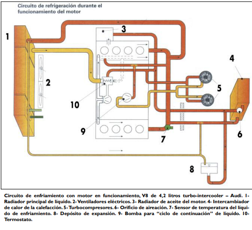 Las juntas de tapa de cilindros también son consideradas y diseñadas de modo tal, de dar paso al caudal de líquido de enfriamiento correspondiente. Cabe destacar que, el radiador de aceite del motor, se encuentra integrado a su vez, al circuito de líquido. En los motores V8 turbosobrealimentados, para evitar todo posible recalentamiento, se utiliza una bomba de agua eléctrica. Después que el motor se detiene, se pueden producir picos de sobrecalentamieto locales, con formación de burbujas de vapor, debido a las altas temperaturas del líquido de enfriamiento, en la zona de los turbosobrealimentadores. Para evitar este inconveniente, se realiza en "ciclo de continuidad" por un tiempo de la bomba denominada "de continuación", del líquido de enfriamiento. La activación de esta bomba, la efectúa la Unidad de Control Electrónico del motor, a través del relé para el ciclo de continuación del líquido refrigerante. La activación de dicha bomba, depende de los sensores siguientes; - Sensor de temperatura del líquido de enfriamiento. - Sensor de temperatura del aceite del motor. - Sensor de temperatura del motor (exterior).