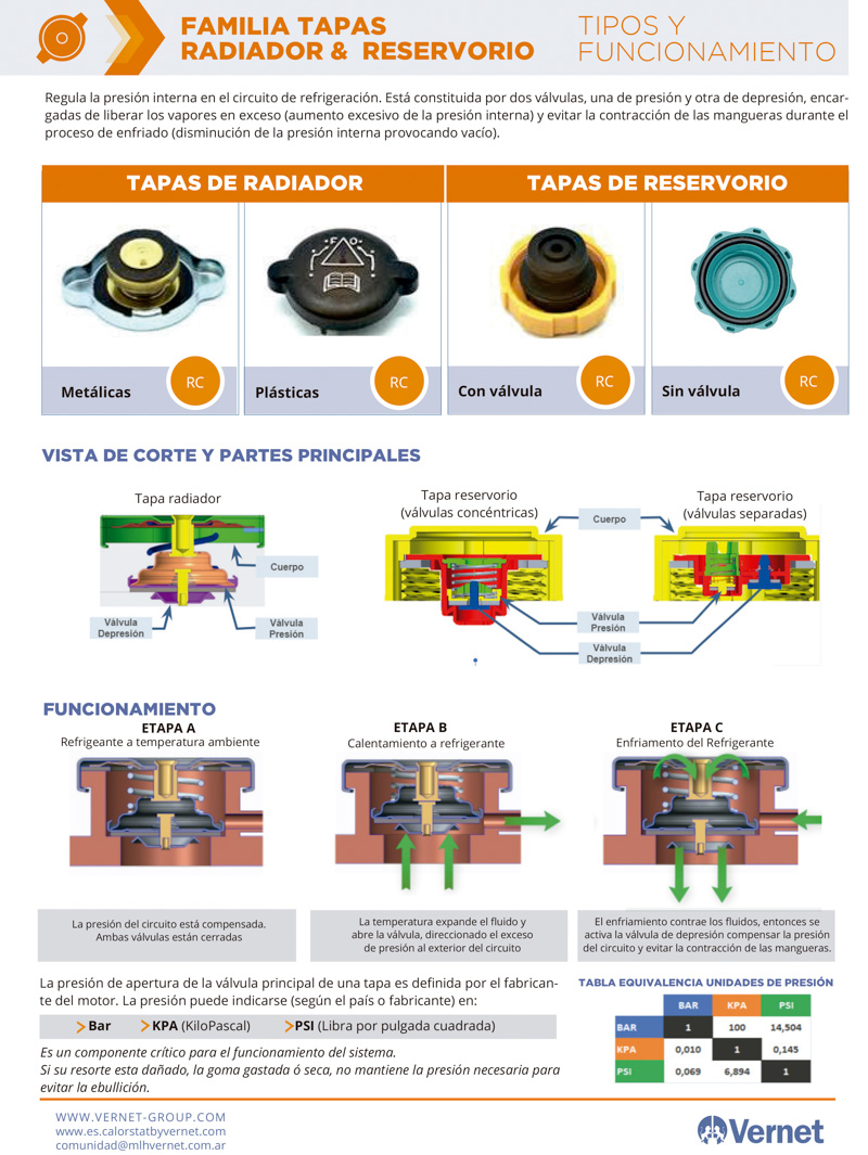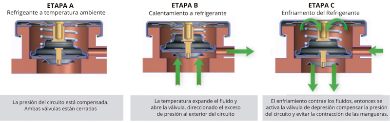 Regula la presión interna en el circuito de refrigeración. Está constituida por dos válvulas, una de presión y otra de depresión, encargadas de liberar los vapores en exceso (aumento excesivo de la presión interna) y evitar la contracción de las mangueras durante el proceso de enfriado (disminución de la presión interna provocando vacío).