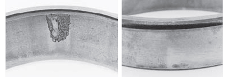 Líneas de descamación espaciadas por los rodillos, en cojinetes mantenidos en servicio después de un fallo de corrosión.