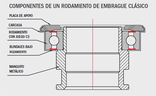 El rodamiento de embrague es una pieza que trabaja conjuntamente con el elemento que lo acciona, permitiendo acoplar y desacoplar el motor de la caja de cambios.